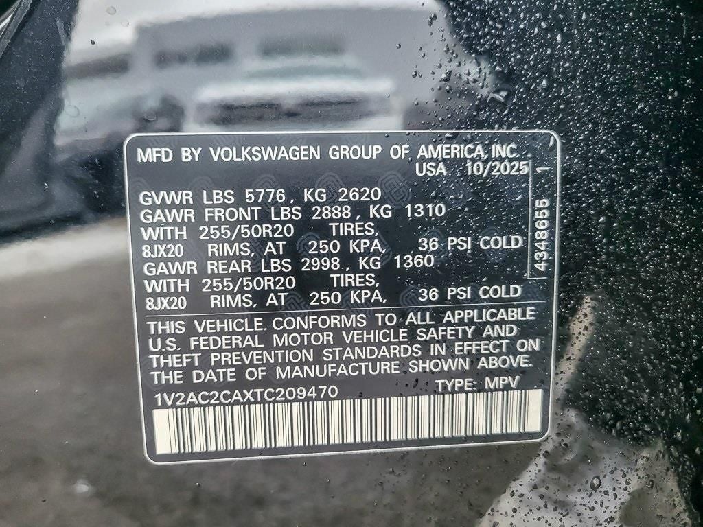 KEY FEATURES INCLUDE: MDO Package, 4-Wheel Disc Brakes, 4-Wheel Independent Suspension, 6 Speakers, ABS brakes, Air Conditioning, Alloy wheels, AM/FM radio: SiriusXM with 360L, Auto High-beam Headlights, Auto-dimming Rear-View mirror, Automatic temperature control, Brake assist, Bumpers: body-color, Compass, Delay-off headlights, Driver door bin, Driver vanity mirror, Dual front impact airbags, Dual front side impact airbags, Electronic Stability Control, Emergency communication system: VW Car-Net Safe & Secure 5-year, Exterior Parking Camera Rear, Four wheel independent suspension, Front anti-roll bar, Front Bucket Seats, Front Center Armrest, Front dual zone A/C, Front fog lights, Front reading lights, Fully automatic headlights, Garage door transmitter: HomeLink, Heads-Up Display, Heated door mirrors, Heated front seats, Heated rear seats, Heated steering wheel, Illuminated entry, Low tire pressure warning, Memory seat, Navigation System, Occupant sensing airbag, Outside temperature display, Overhead airbag, Overhead console, Panic alarm, Passenger door bin, Passenger vanity mirror, Perforated Vienna Leather Seating Surfaces, Power door mirrors, Power driver seat, Power Liftgate, Power moonroof: Panoramic, Power passenger seat, Power steering, Power windows, Radio data system, Rain sensing wipers, Rear anti-roll bar, Rear reading lights, Rear seat center armrest, Rear window defroster, Rear window wiper, Remote keyless entry, Security system, Speed control, Speed-sensing steering, Split folding rear seat, Spoiler, Steering wheel mounted audio controls, Tachometer, Telescoping steering wheel, Tilt steering wheel, Traction control, Trip computer, Turn signal indicator mirrors, Variably intermittent wipers, Ventilated front seats, VW Care, and Wheels: 20 Black Painted Alloy. Price includes: $2500 - Customer Bonus. Exp. 04/30/2026